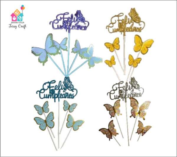 Adorno de torta con el diseño de la frase Feliz cumpleaños y 4 mariposas con stamping oro de diferentes tamaños con pinche. Se utiliza en decoraciones de cumpleaños. Ideal para decoración de tortas, mesa dulce, centro de mesa, candy bar, cup cake, muffins, entre otras cosas.