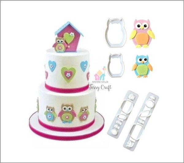 Set de 4 cortantes de plástico para hacer 2 búhos (mama y bebe) , ideal para todo tipo de masas: fondant, mazapán, pasta de azúcar, porcelana fría, plastilina, etc.